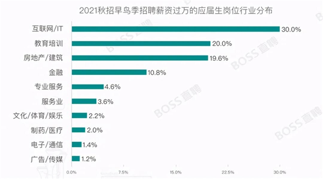 此外,數據還顯示,2021 應屆生平均月薪為 6812 元,月薪過萬的應屆生崗位行業分布,排名的為互聯網/IT行業,占比30%。如果畢業生的技術能力達到企業的標準,薪資還會更高。