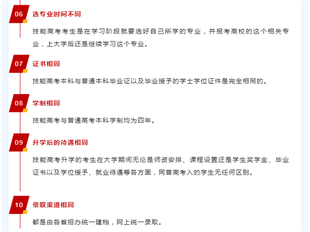 技能高考與普通高考同等學(xué)籍,同等待遇,畢業(yè)證完全一樣,很多學(xué)校的技能高考生和普通高考生入學(xué)后在同一個(gè)班上課。而且技能的掌握和運(yùn)用要比普高生更熟練,畢業(yè)后既有大專/本科學(xué)籍,又有技能水平。