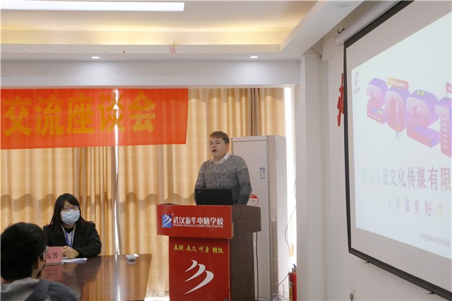 校企交流座談會上,湖北飛音文化傳媒領導對公司進行了詳細的講解,并針對新華學子的現場提問進行了答疑解惑。同時,會上雙方就產教融合項目達成共識,飛音文化傳媒領導充分肯定武漢新華學子的能力,同樣也十分期待武漢新華學子的學成加入。