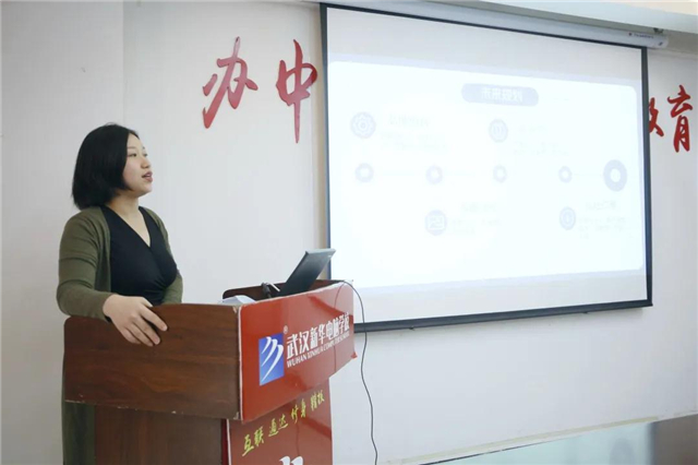 接著,武漢新華創就業指導基地劉老師詳細介紹了學校辦學特色、人才培養模式及實踐教學等情況。她希望,在人才培養、專業建設等方面與企業進一步合作,企業針對自身文化與崗位需求,與學校共同育人,并為新華學子提供更多的實習與就業崗位。